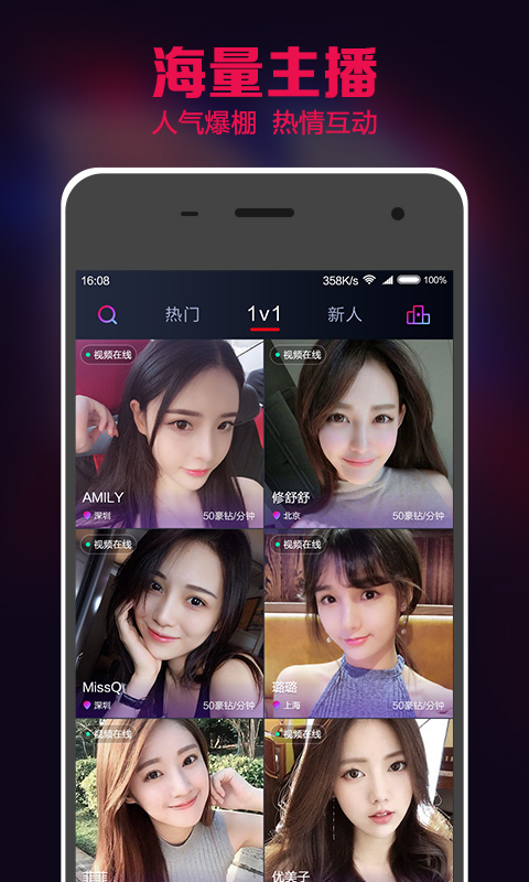 丰富的主播类型,这里有在读校花、护士、服务员、工人、职业白领、舞者、网络歌手、草根明星、知名歌手等不同类型从业者,总有一类与你经历相同,彼此相似。相知、相爱、相守只需手指轻轻触动,即刻拥有爱情。